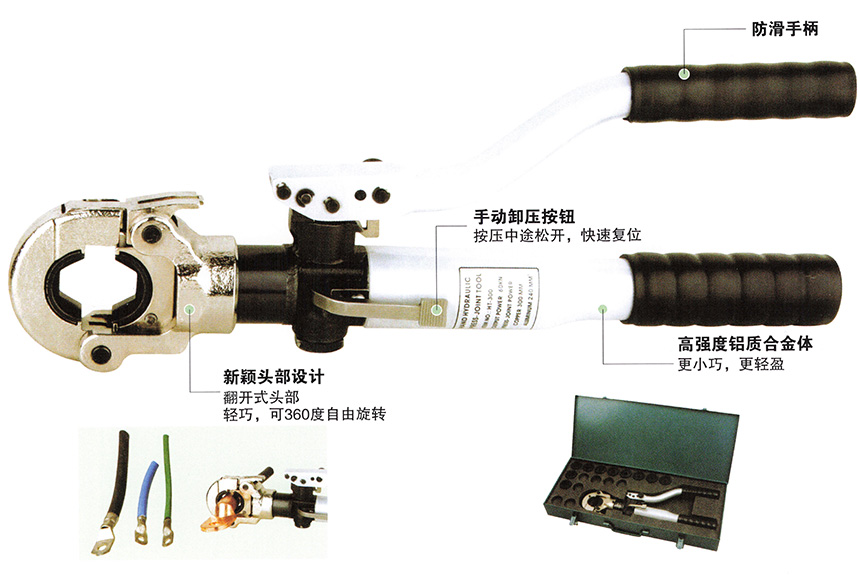 ■ C型鉗頭且可360度旋轉(zhuǎn),在完全壓接后自動卸壓,必要時也可手動卸壓;